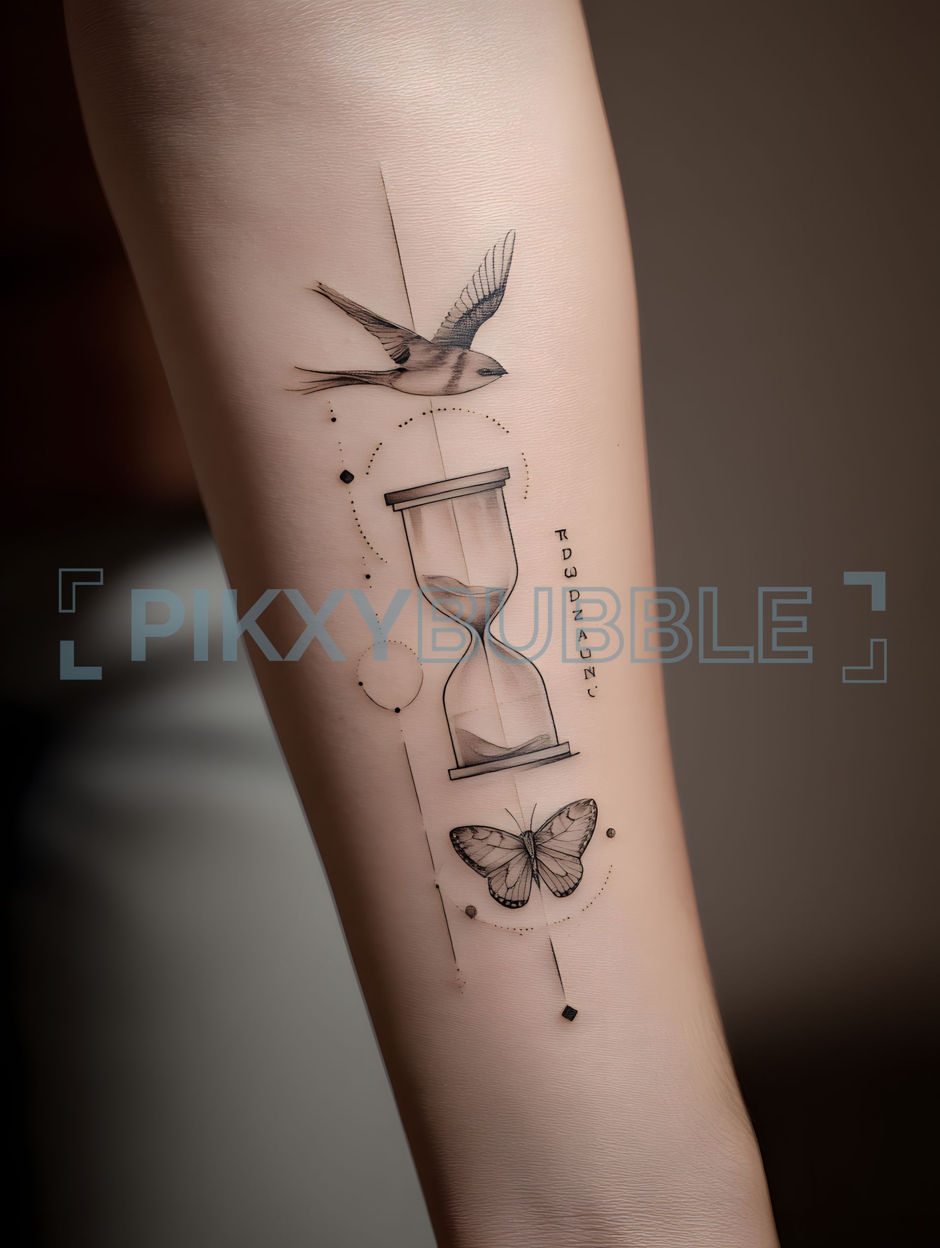 Ce tatouage représente des éléments symboliques tels qu'un oiseaux, un sablier et un papillon.
