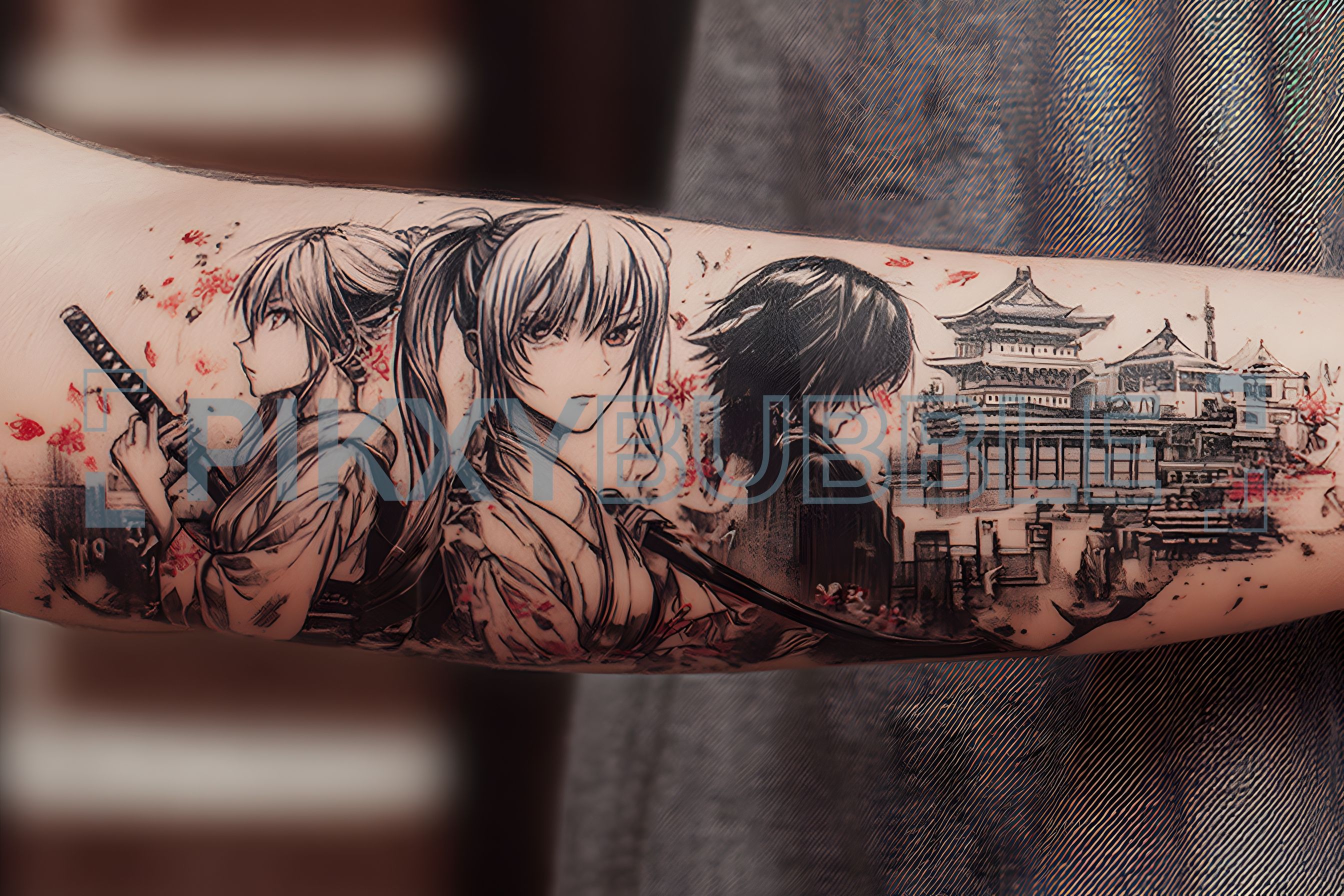 Tatouage artistique en noir et blanc représentant des personnages du monde anime. Voici ce que vous pouvez y voir :