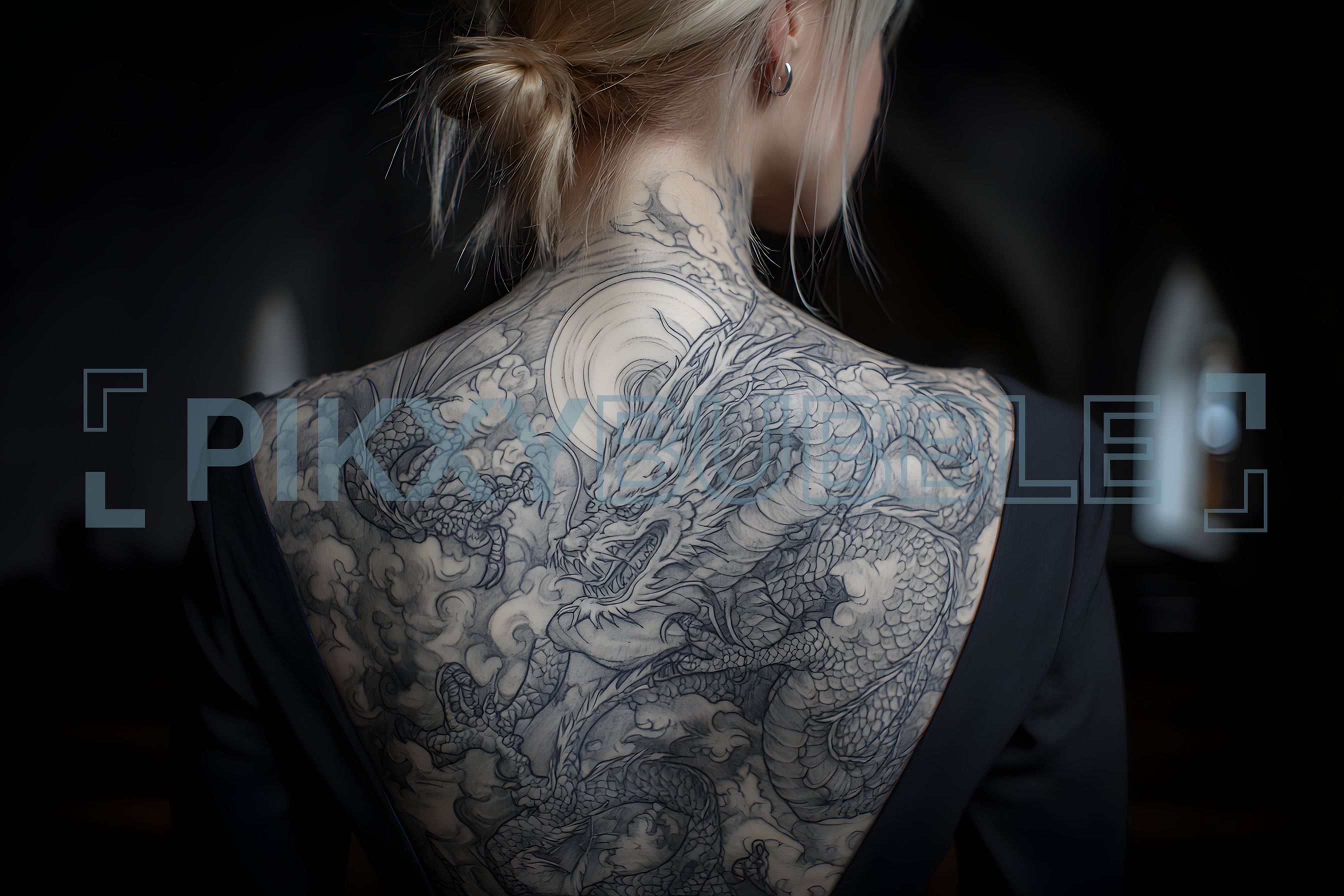 Tatouage de dragon en noir et blanc sur le dos, symbolisant la force et la protection.