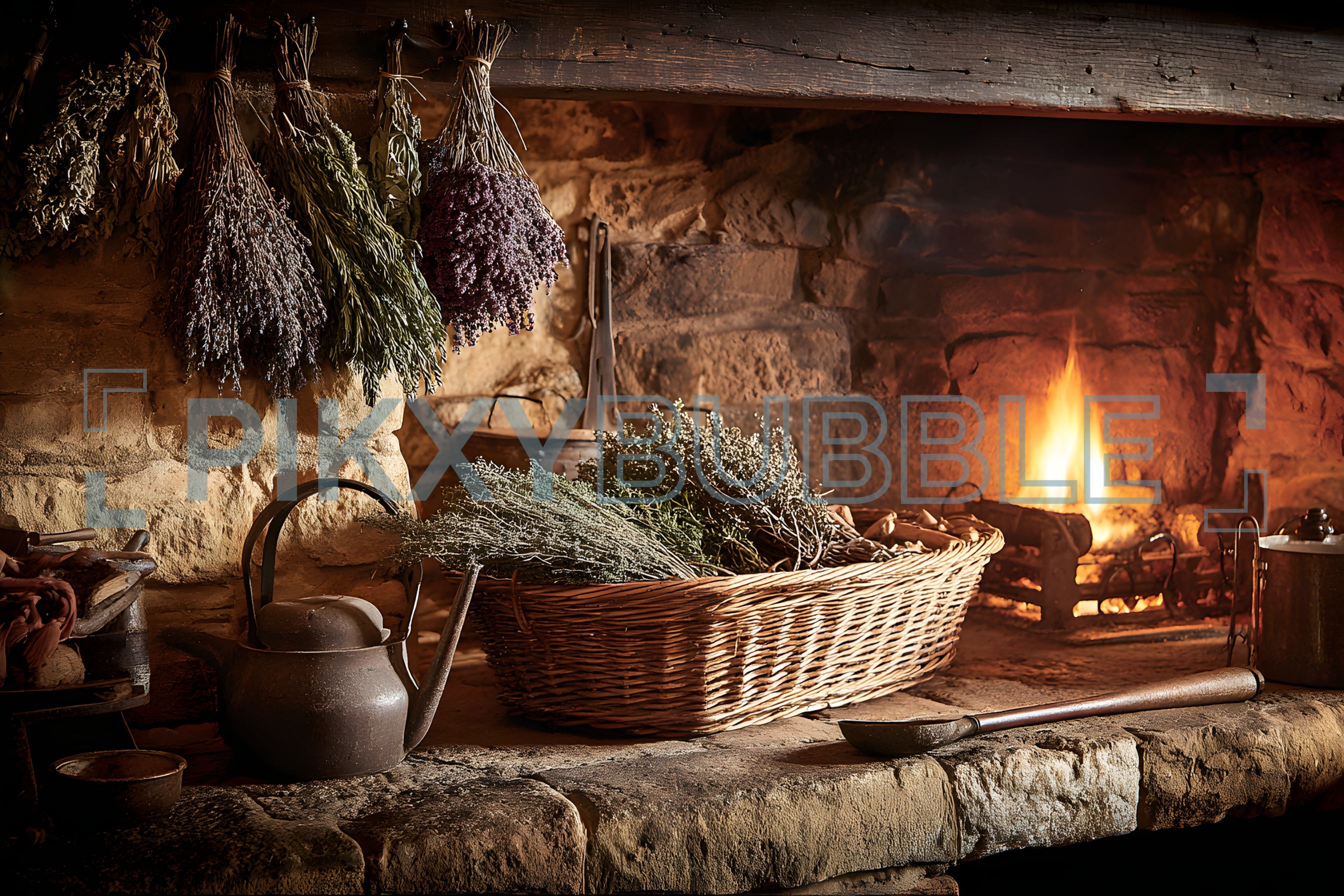 Une cuisine rustique avec des herbes séchées suspendues et une