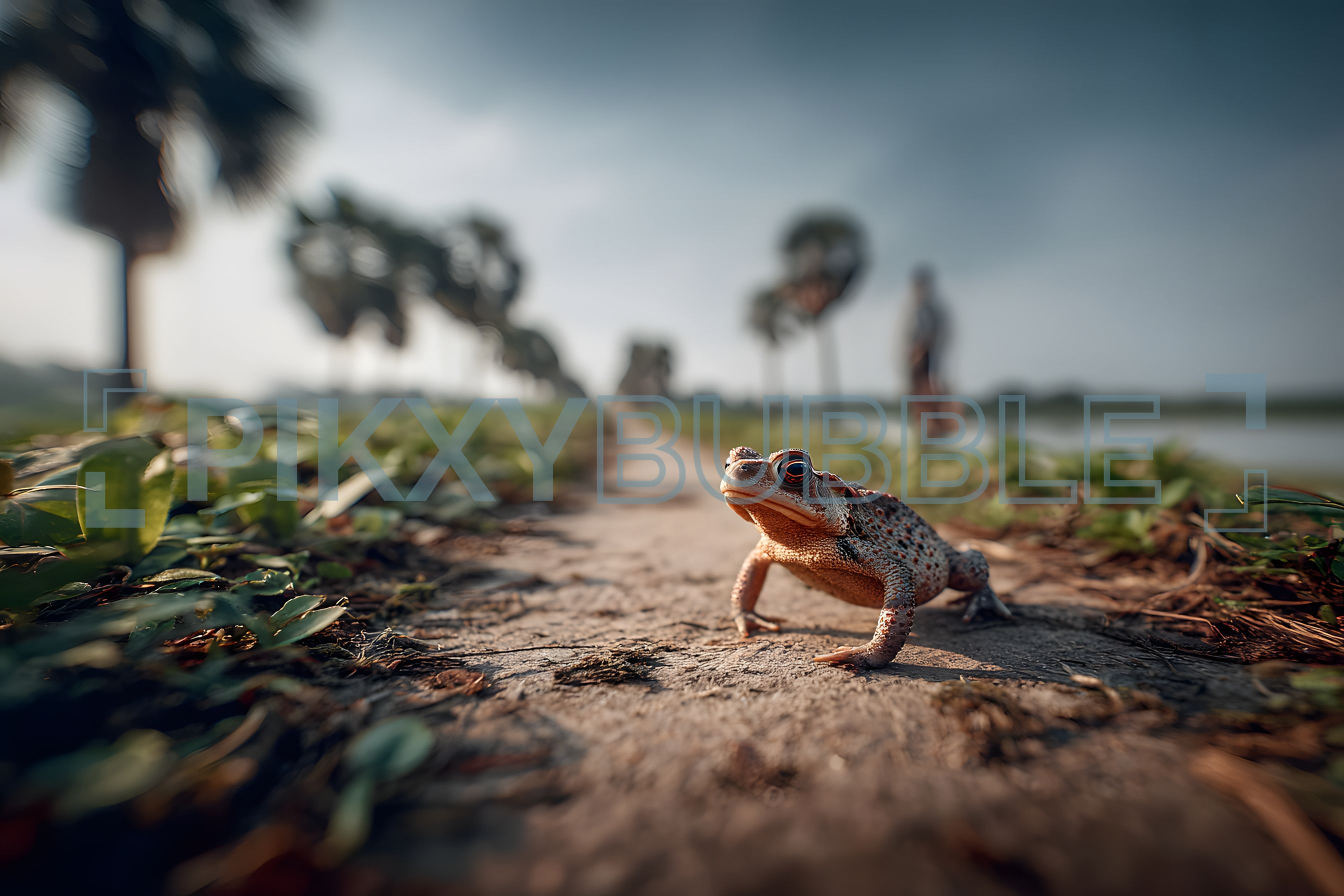 Cette image représente une grenouille se tenant sur un chemin. Les éléments clés incluent :