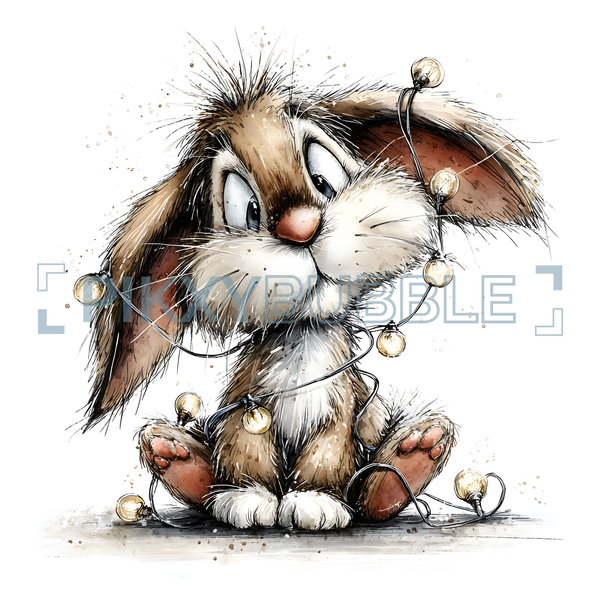 Voici un adorable lapin qui se retrouve dans une situation cocasse. Il est entouré de guirlandes lumineuses et semble amusé.