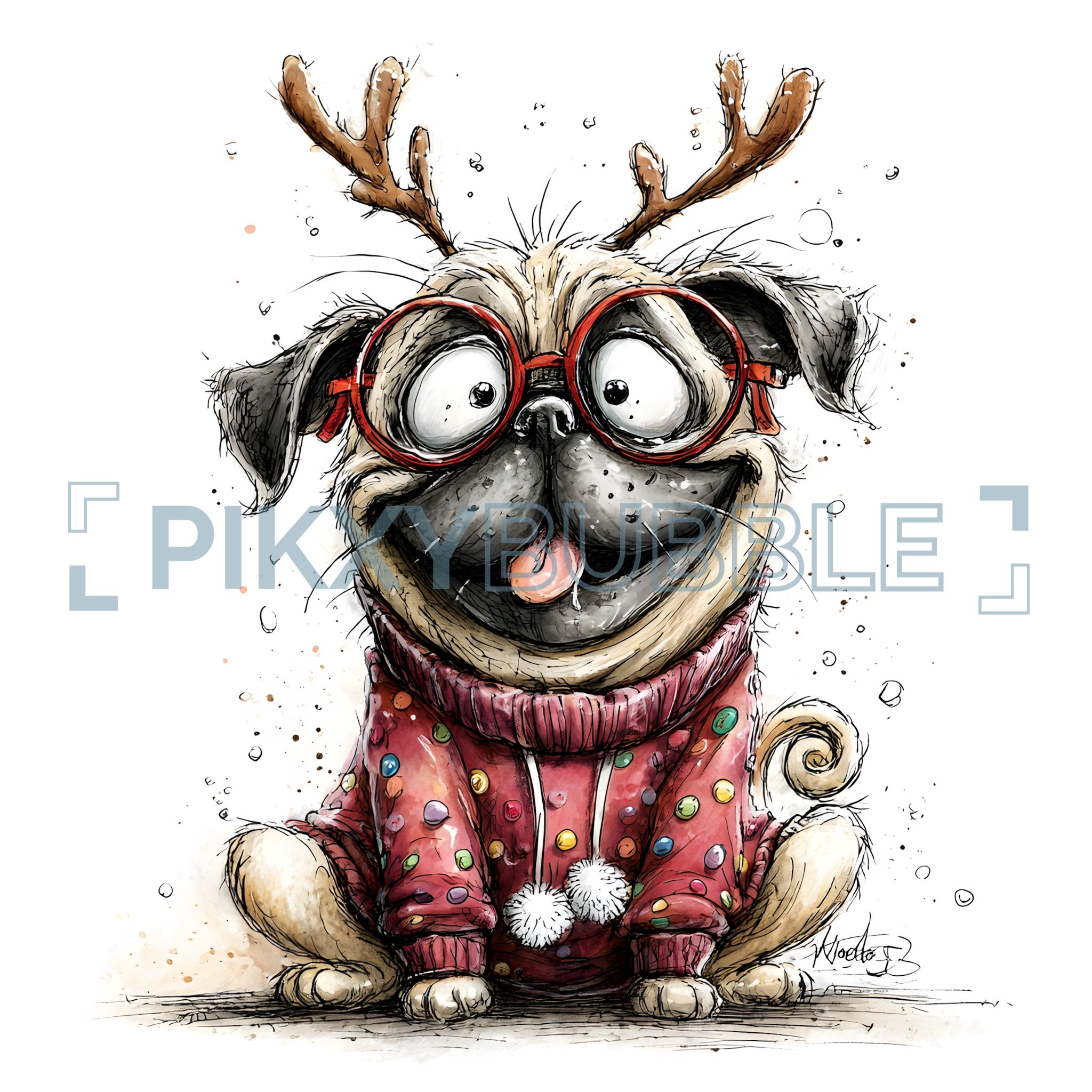 Un adorable petit chien avec des antlers et des lunettes. Il est vêtu d'un pull coloré rempli de