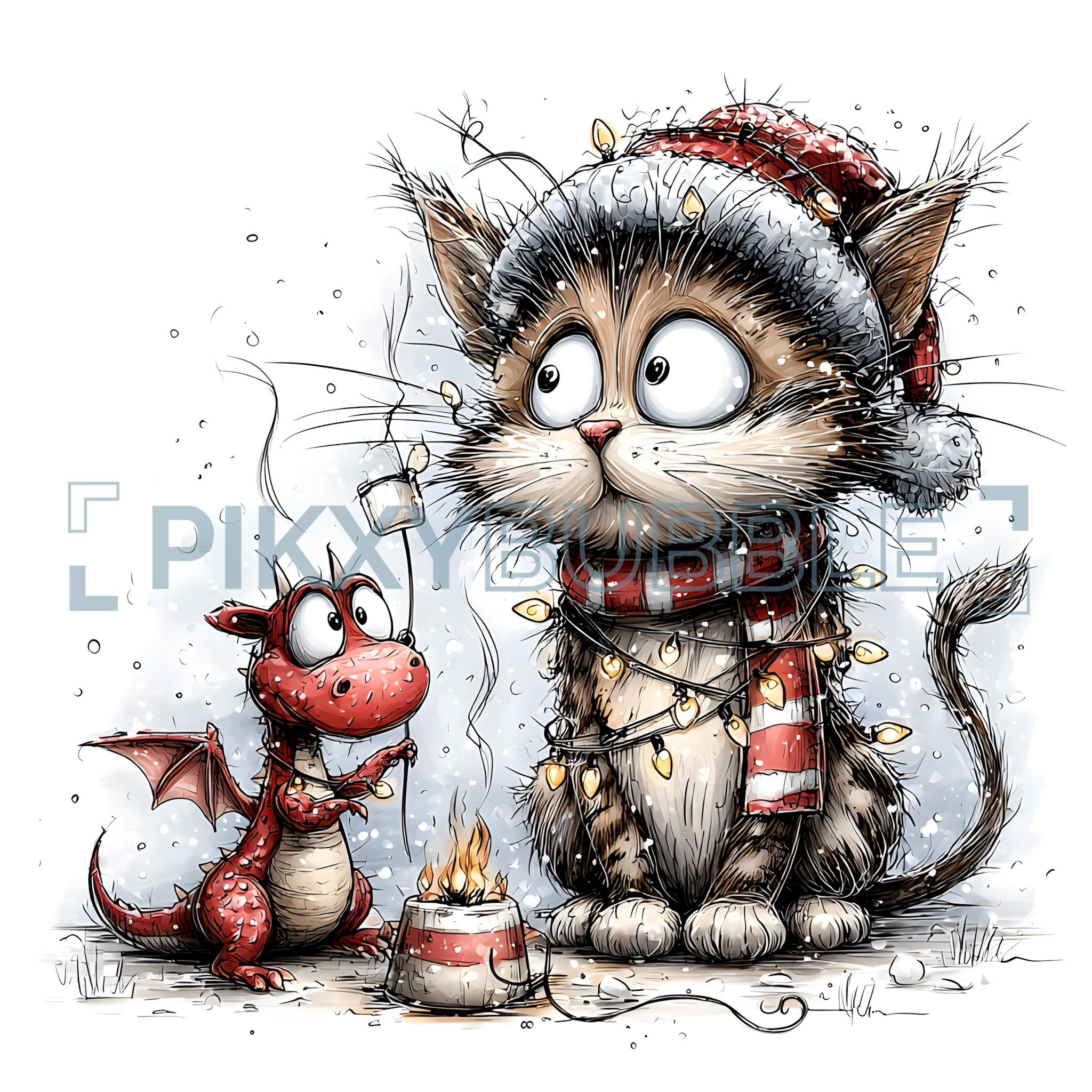 Un adorable matou et un petit dragon s'amusent dans la neige. Voici ce que vous allez trouver :