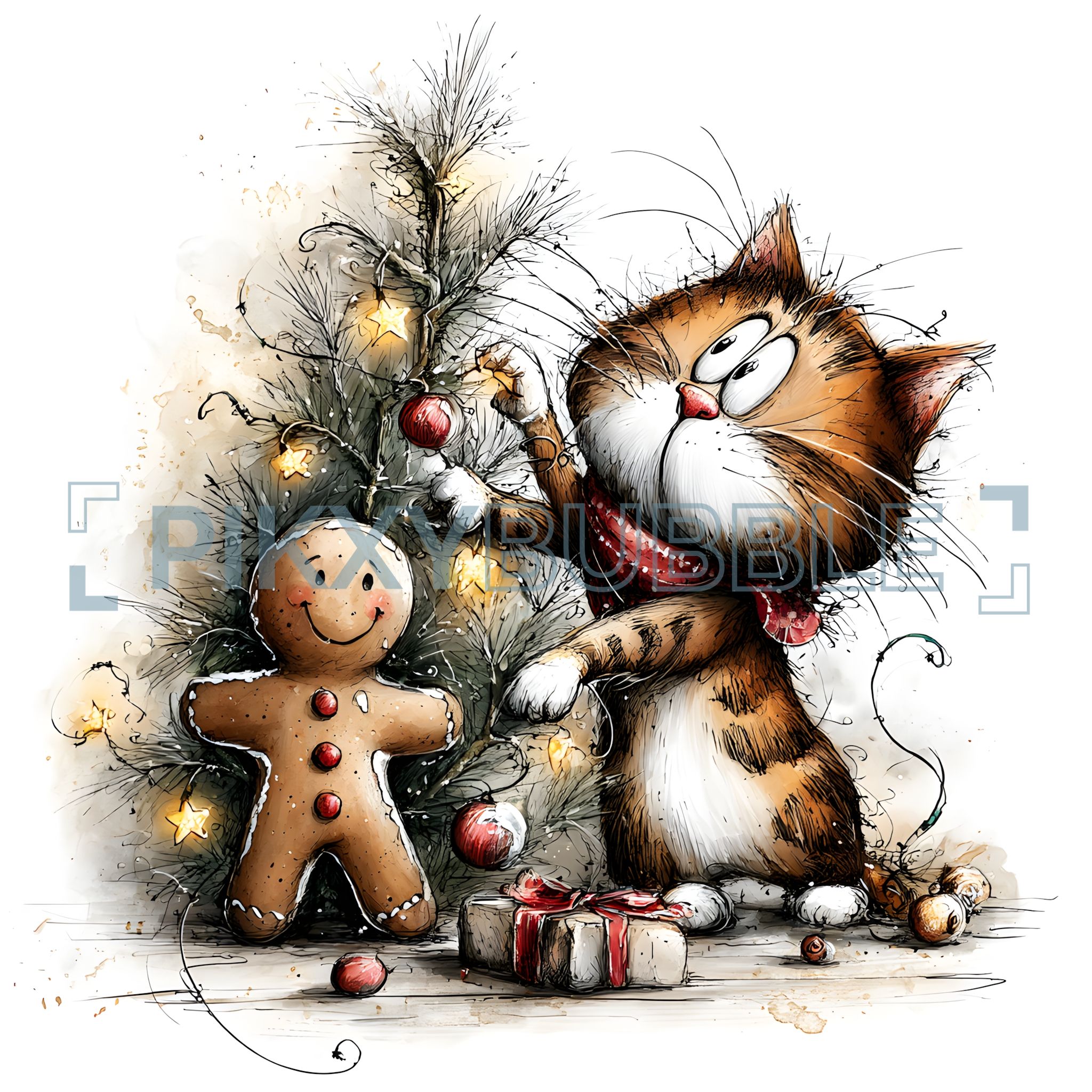 - Un chat mignon orne le sapin.