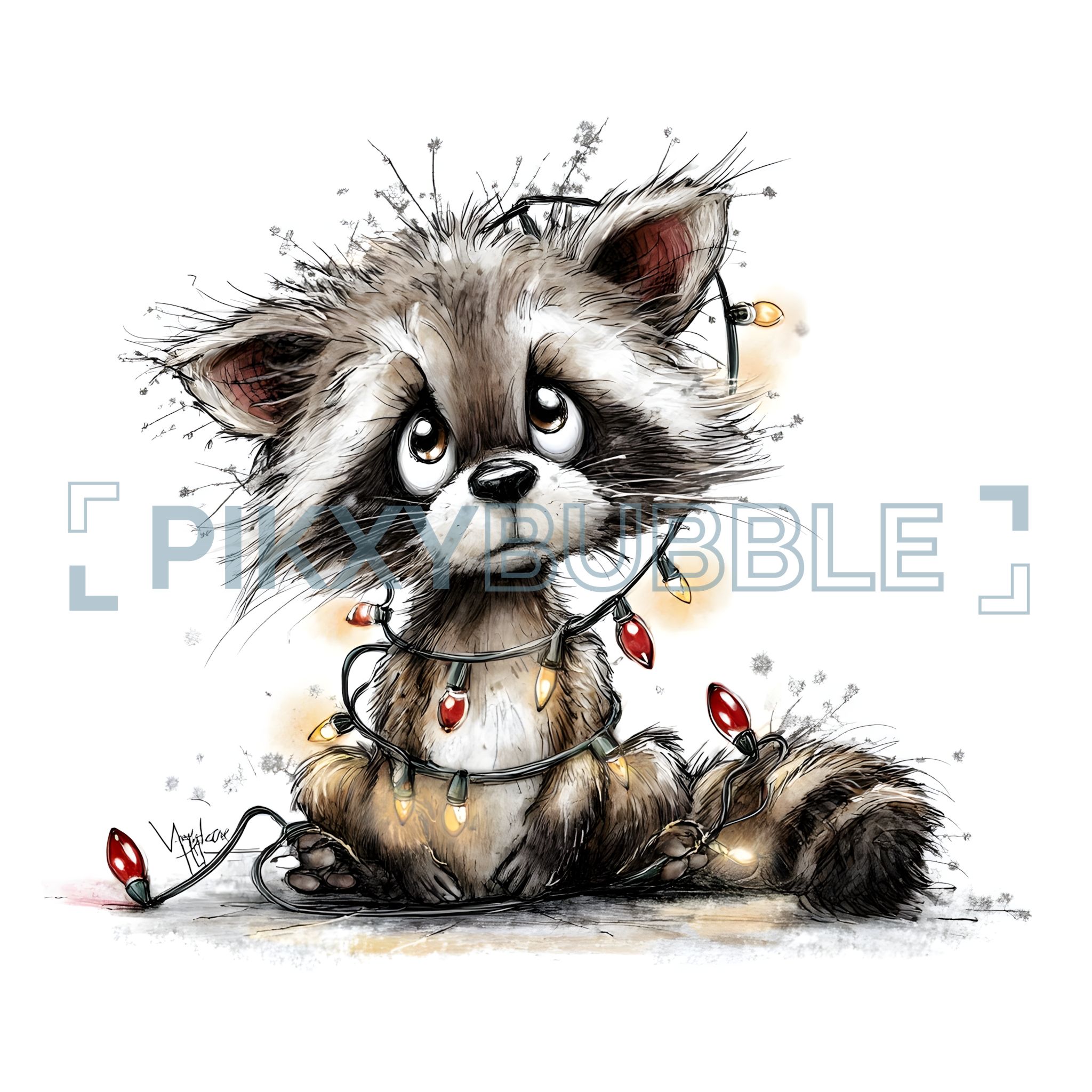 Un petit racoon adorable qui s'est retrouvé enchevêtré dans des lumières de Noël. Ce personnage fragile symbolise l'esprit des fêtes.