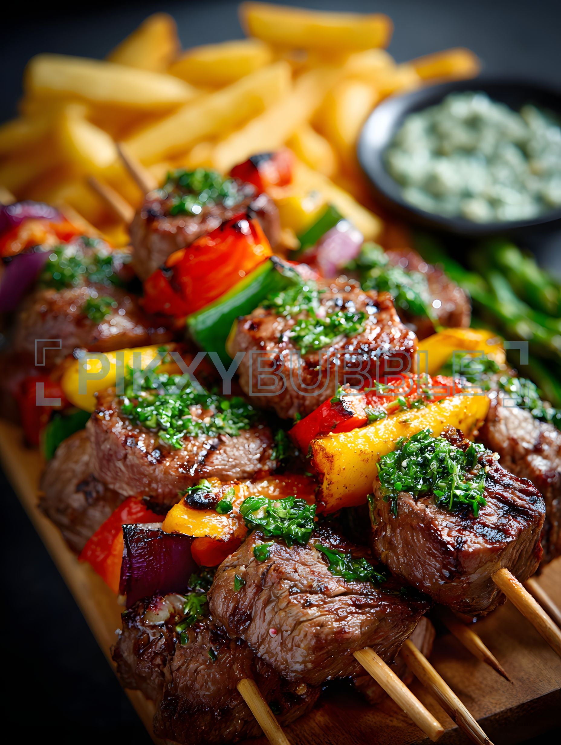 Délicieuses brochettes de viande accompagnées de frites croustillantes.