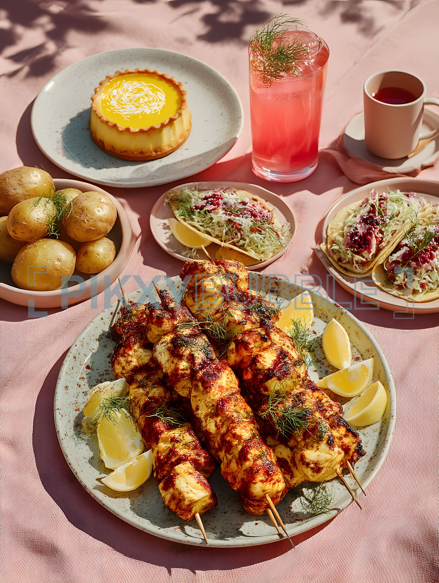 Découvrez nos plats délicieux : Brochettes épicées, tacos frais et flan sucré.
