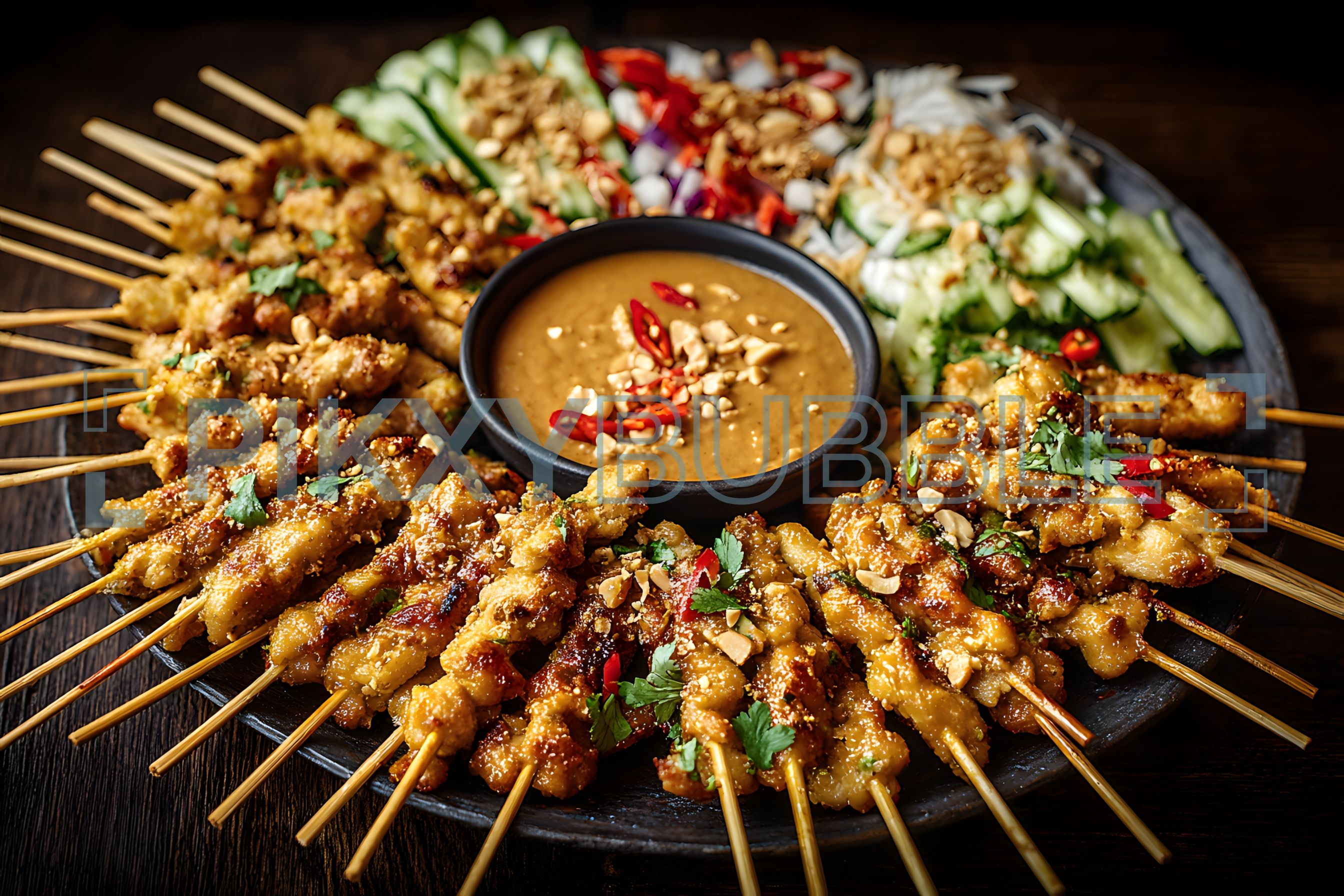 Dégustez notre plat délicieux : des brochettes de poulet marinées au satay, accompagnées d'une sauce cacahuète savoureuse. Voici les ingrédients principaux: